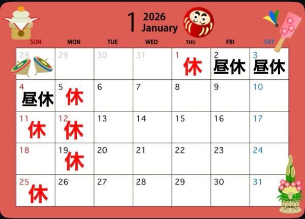 1月の営業日です!※2〜4日はランチ営業のみお休み致します。夜の営業は行っております!よろしくお願い...