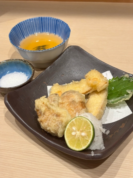 【松茸の天ぷら】…カリッと揚げた松茸の香りが口いっぱいに広がります!お出汁でも美味しかったですが、...