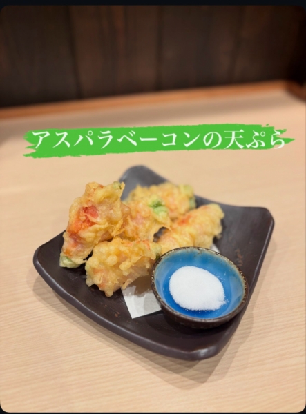 【アスパラベーコンの天ぷら】定番のアスパラベーコンを焼き物や炒め物にせずに、カリッと天ぷらにしま...
